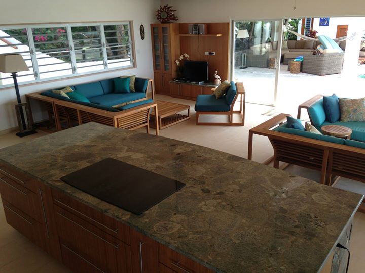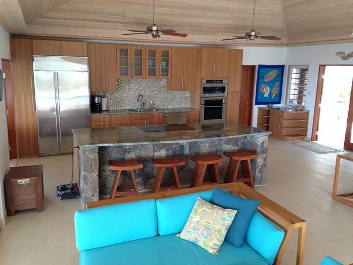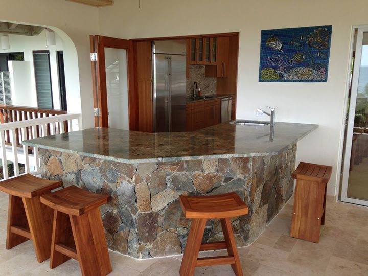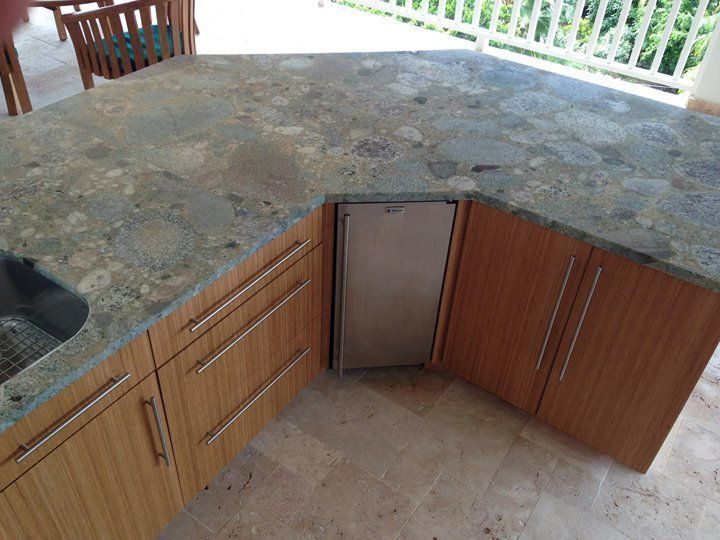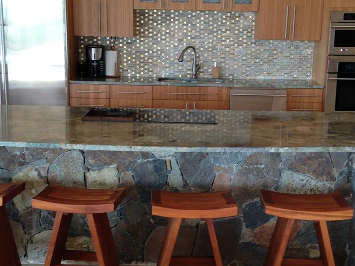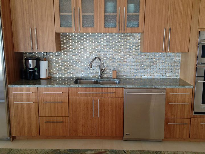 Luxury Line by Tedd Wood custom Cabinetry, Solid Bamboo Door Style "Plyboo" Cabinetry "Jurassic" color granite countertops, Stainless Steel Bar Pulls