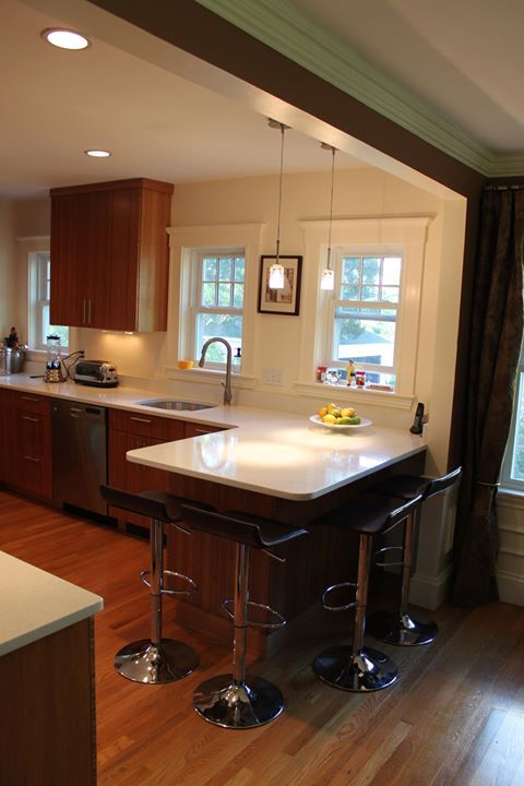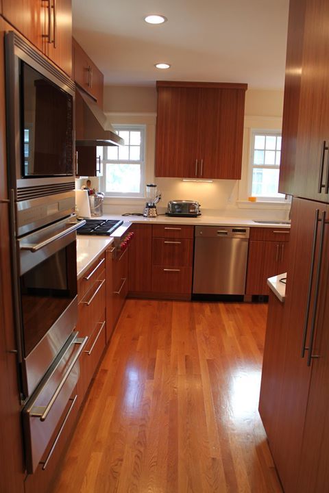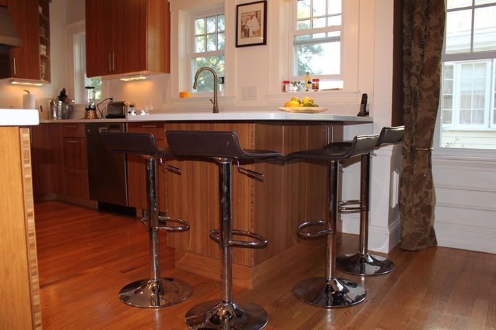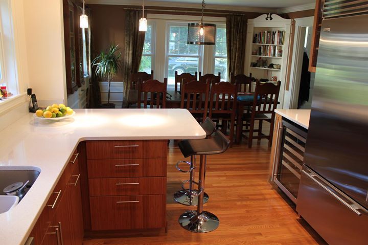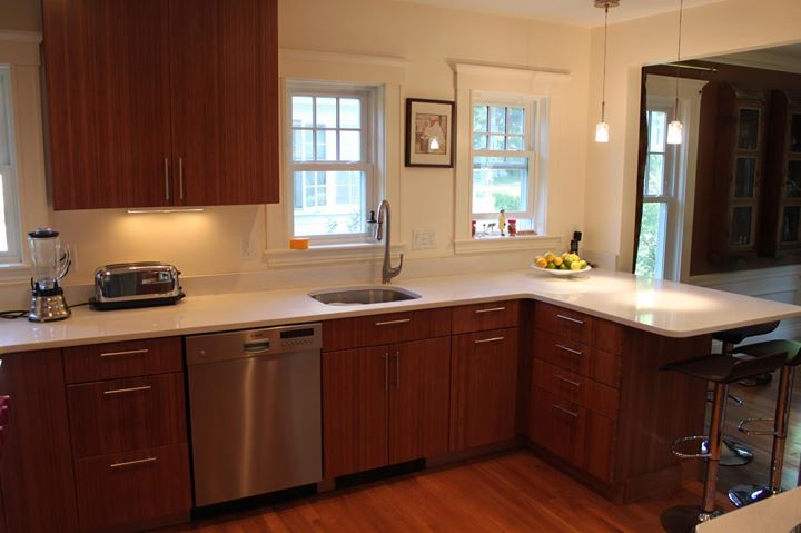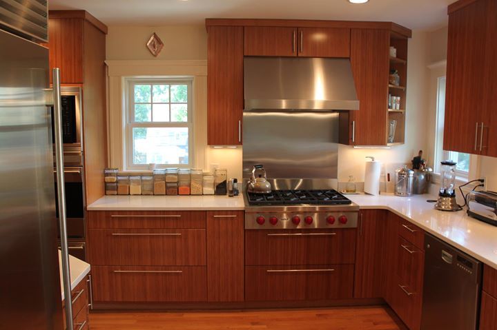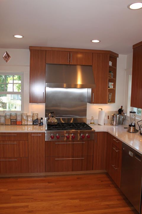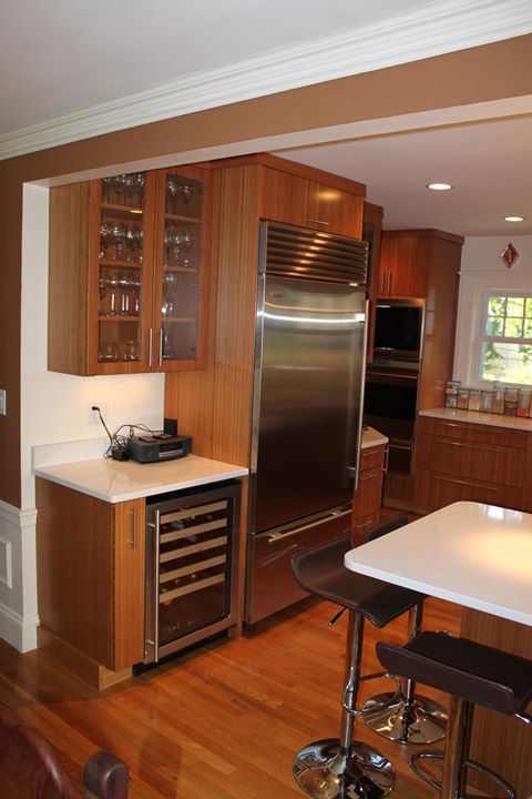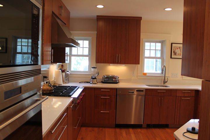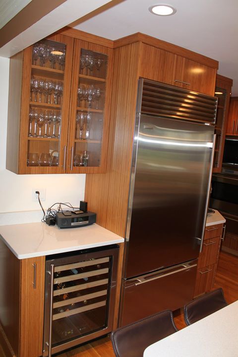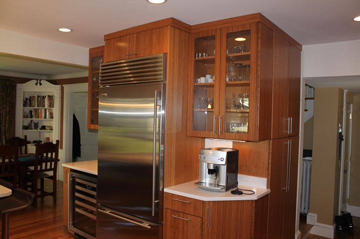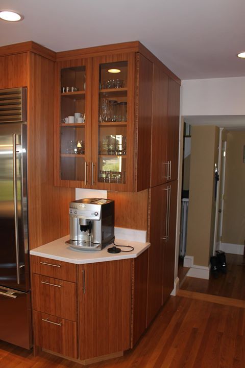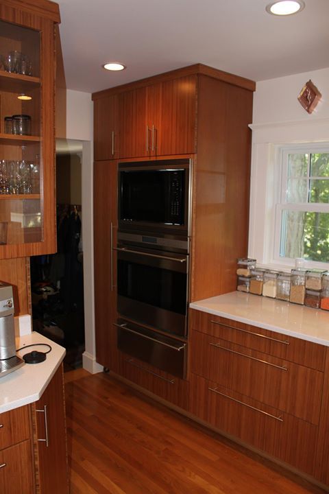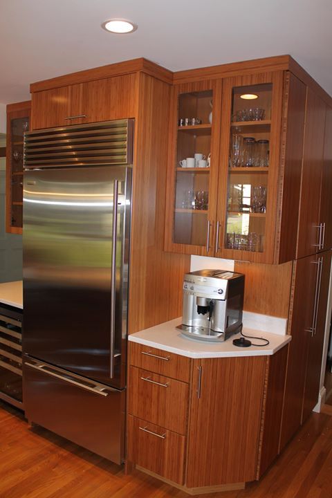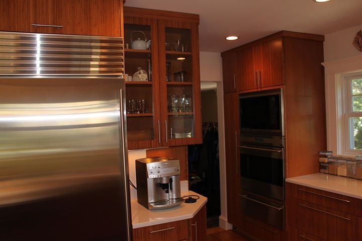Tedd Wood Luxuty Line cabinetry in Plyboo (Solid Bamboo) door style with Cabria Snow White quartz Countertops. Remodeling done by Stealth Construction