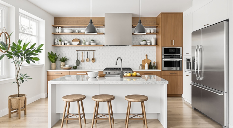 A waterfall island, where the countertop material flows down the sides to the floor, brings a sleek and updated take on mid-century inspiration. Pairing wood accents with stone surfaces adds warmth and balance. For example, a walnut island base with a white quartz top creates a look that feels both classic and fresh.