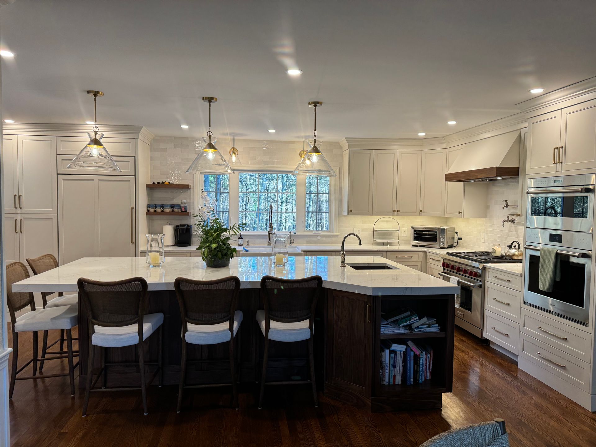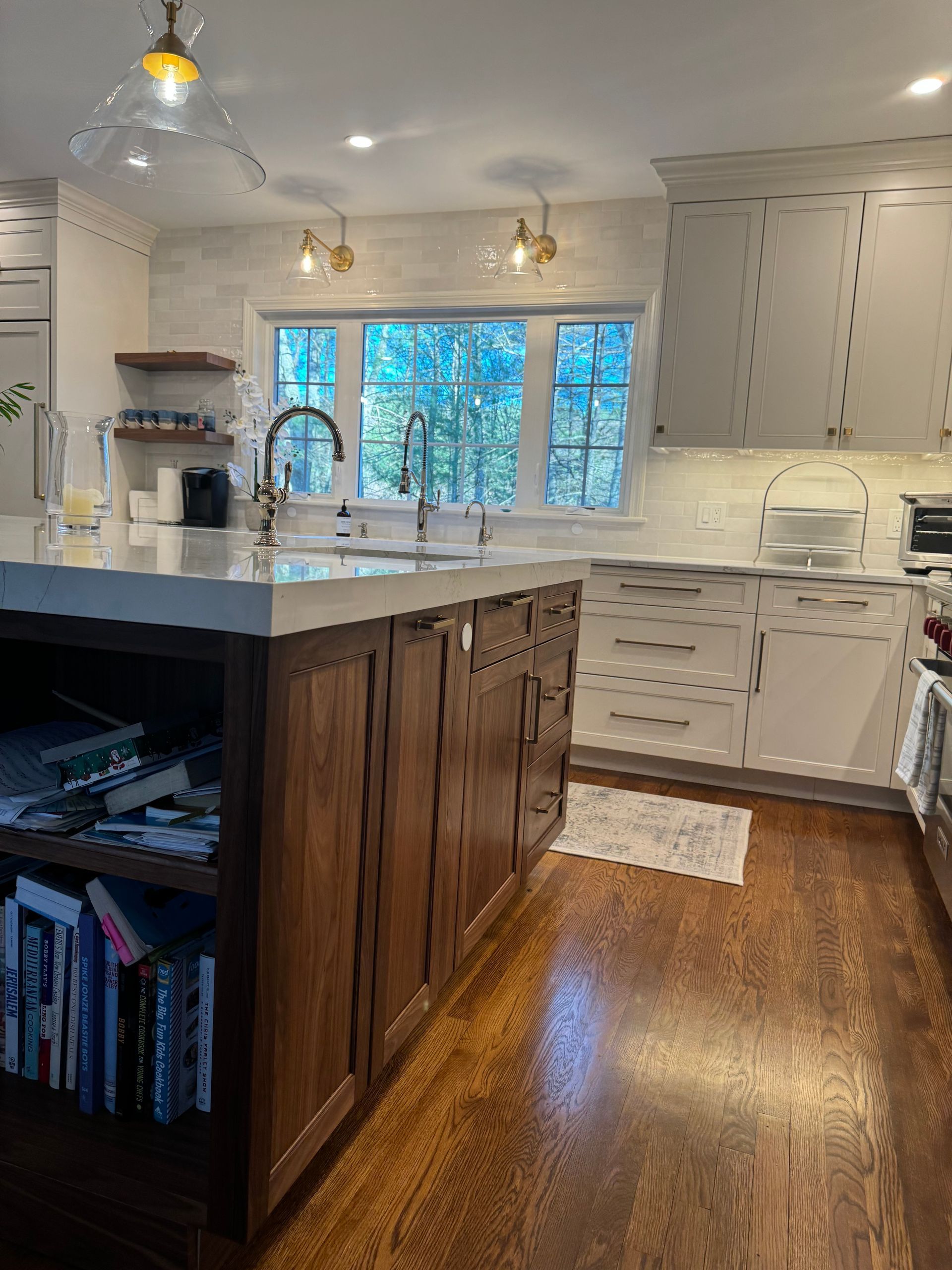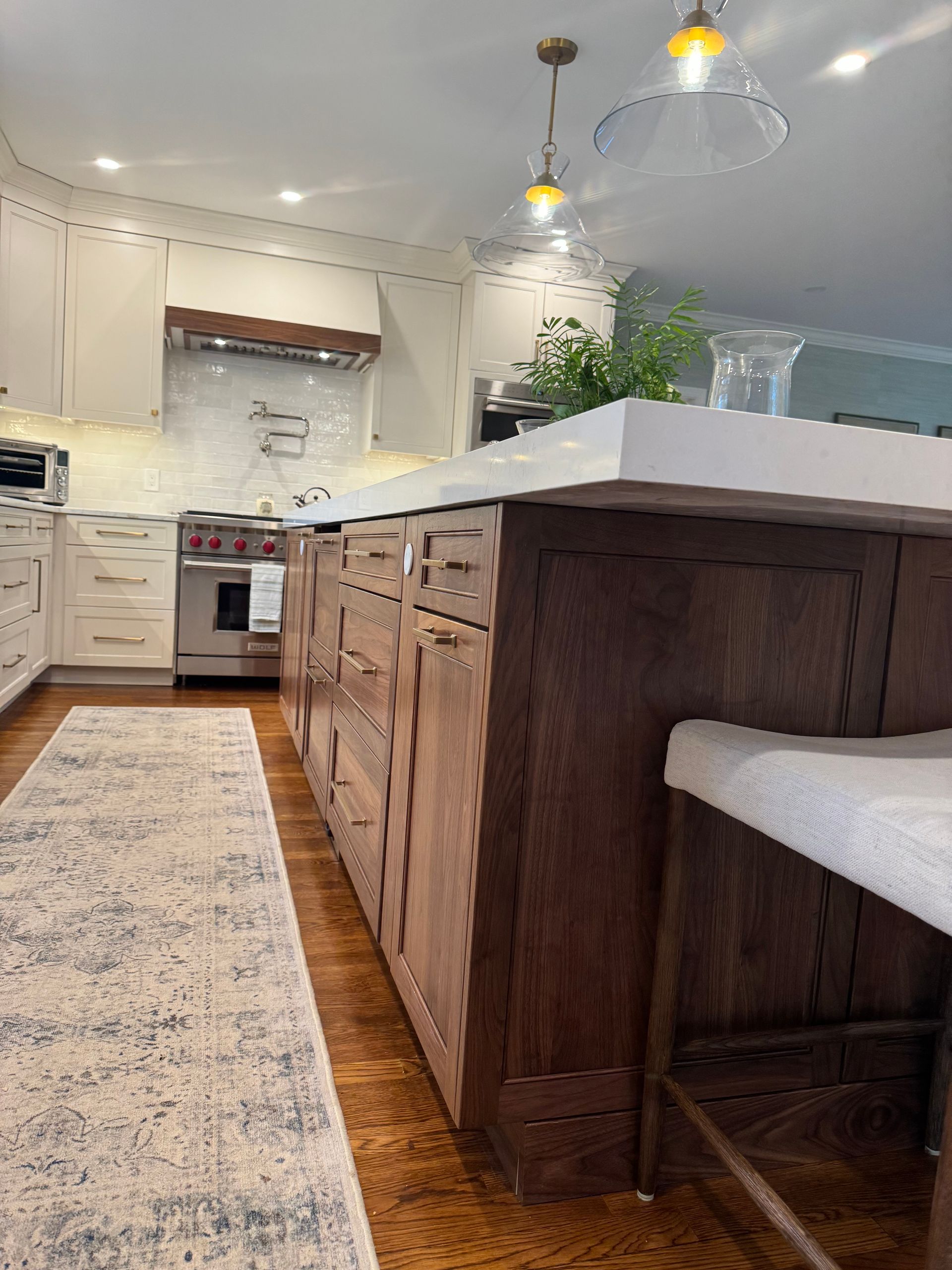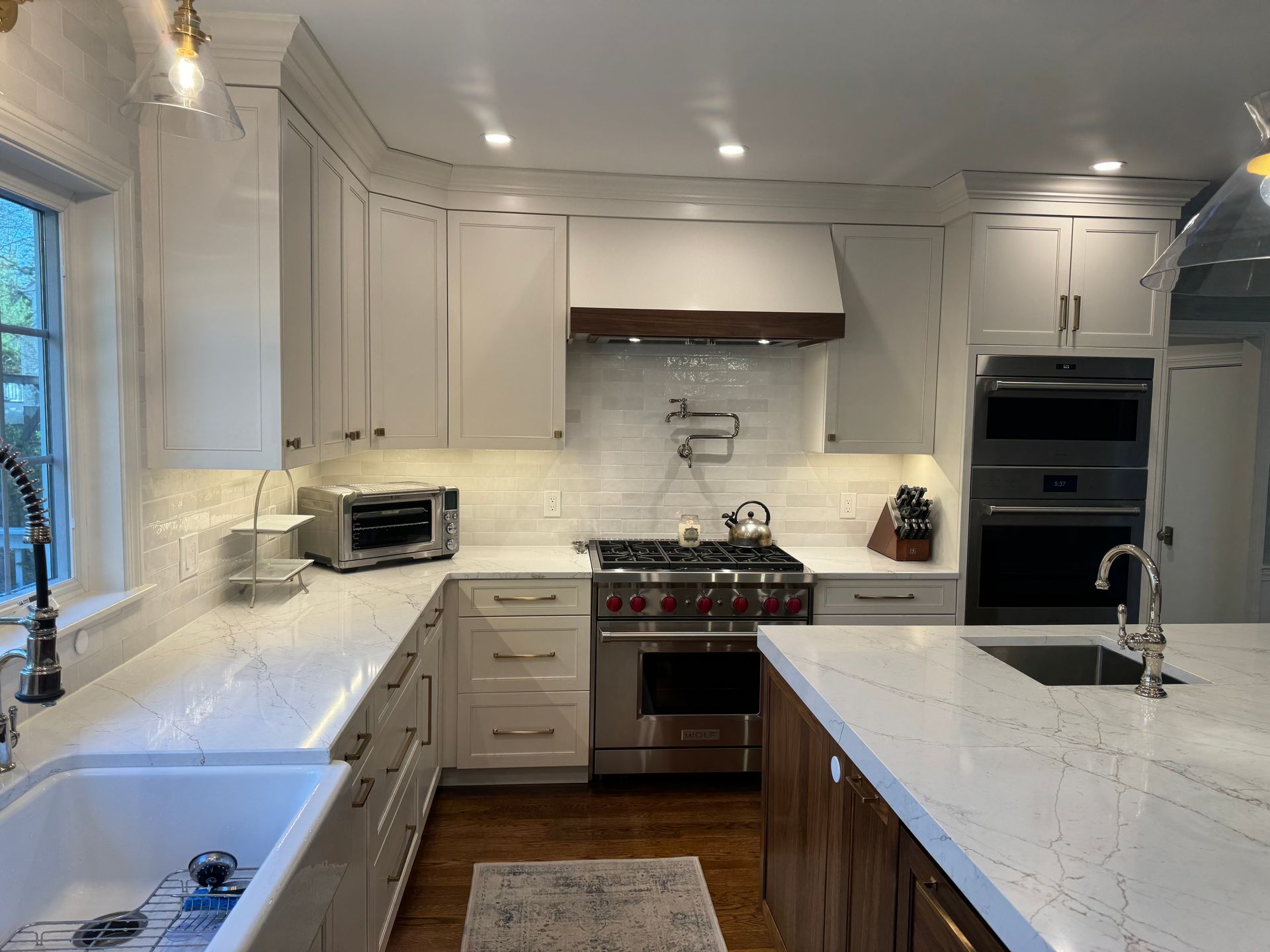 Tedd Wood Luxury Line Custom Monticello Door Style with Alasbaster White paint Finish on perimeter of kitchen & Hand selected natural walnut island. Counter top is Q-Quartz Calacatta Veraldi featuring a double thisck island.