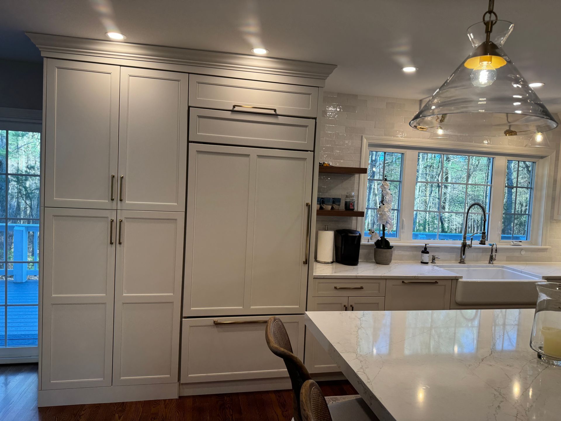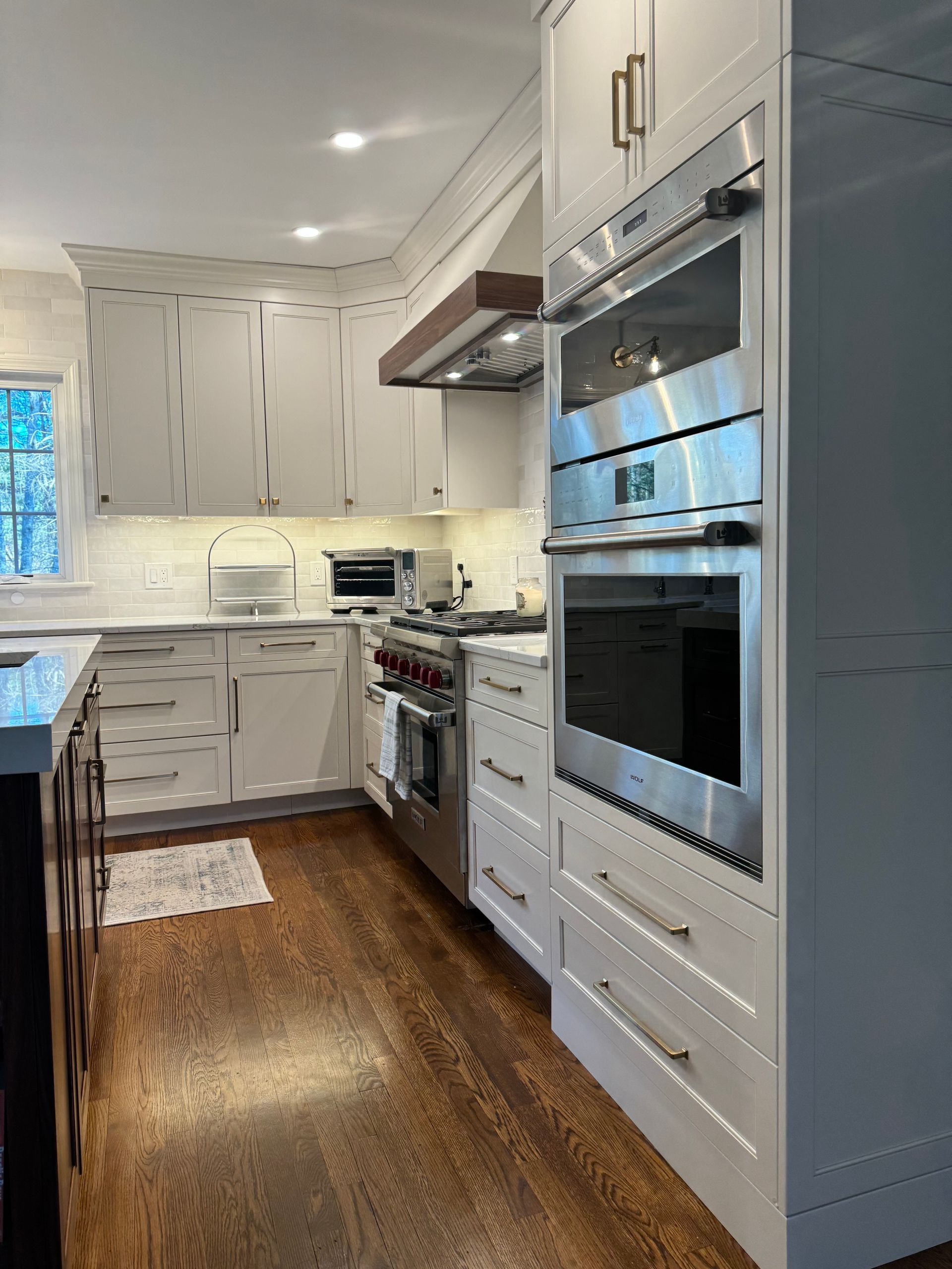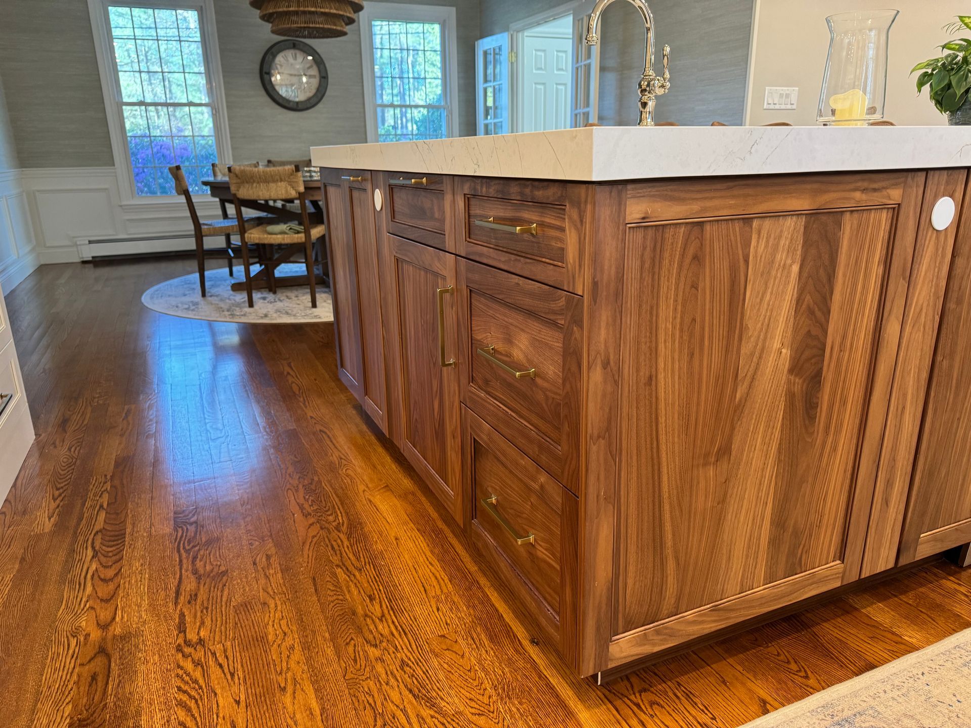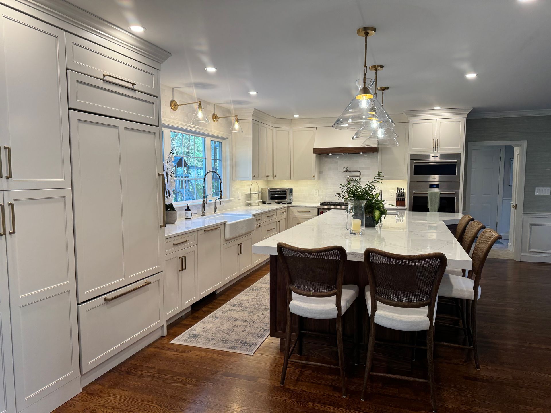 Tedd Wood Luxury Line Custom Monticello Door Style with Alasbaster White paint Finish on perimeter of kitchen & Hand selected natural walnut island. Counter top is Q-Quartz Calacatta Veraldi featuring a double thisck island.