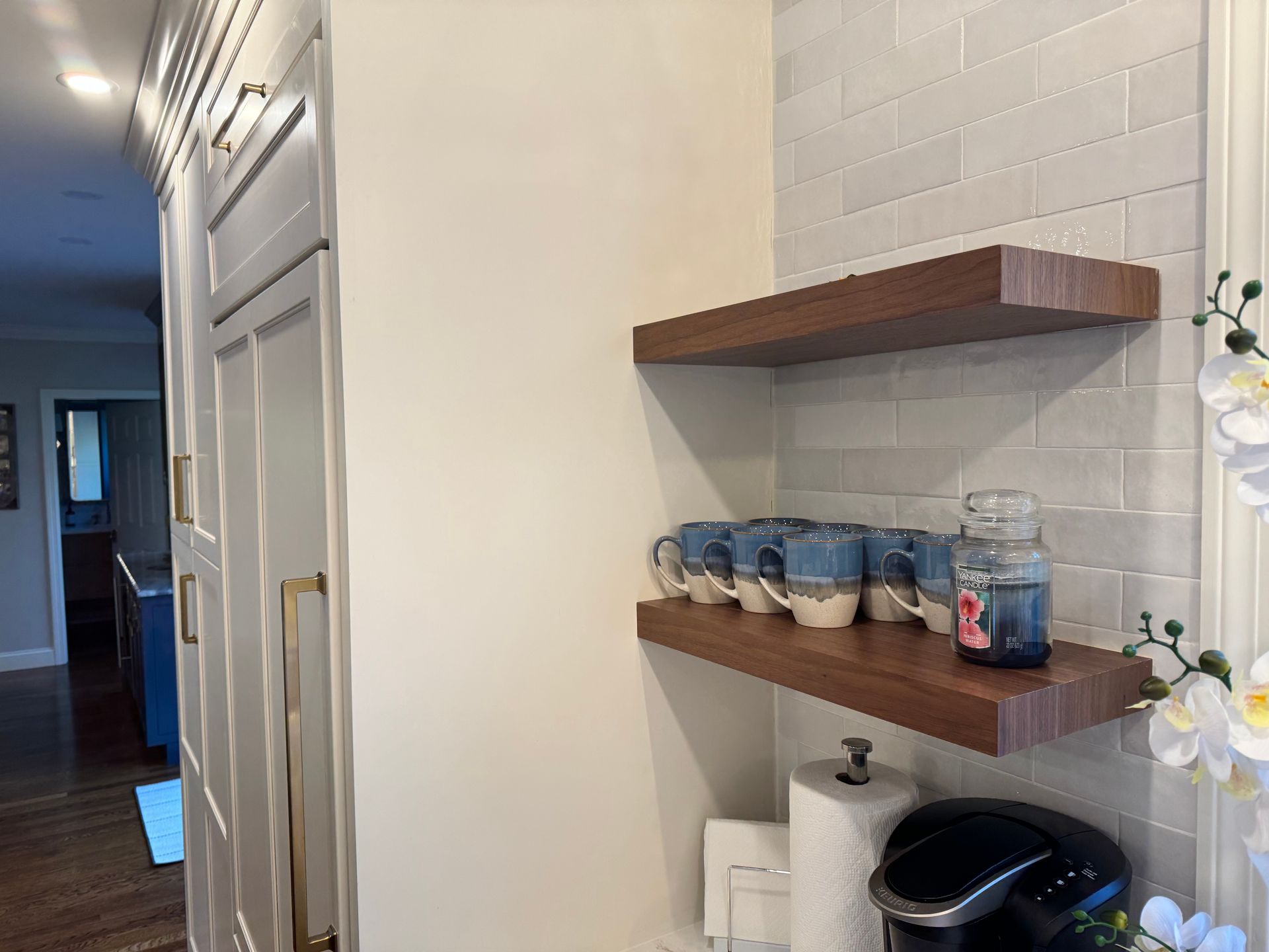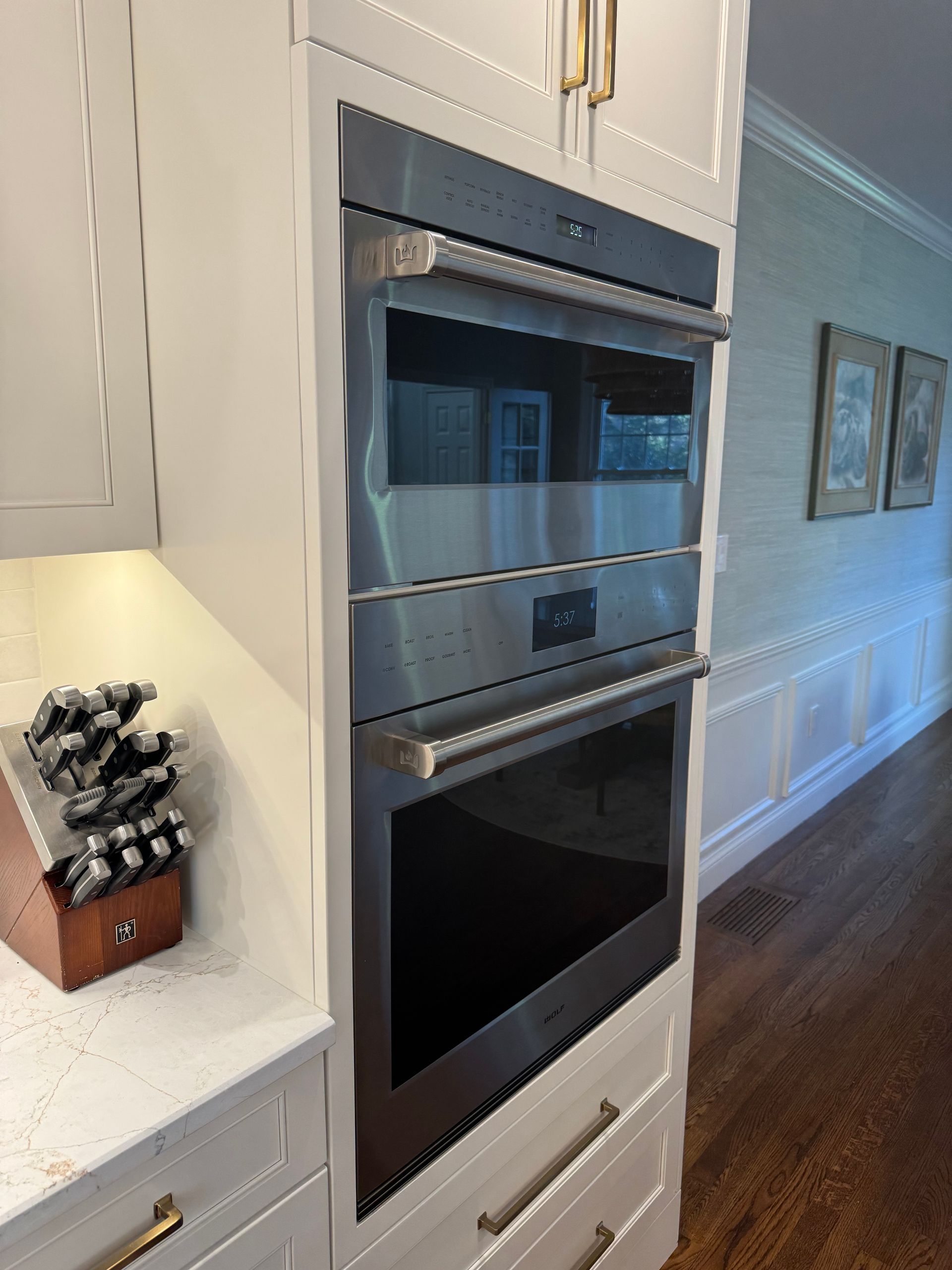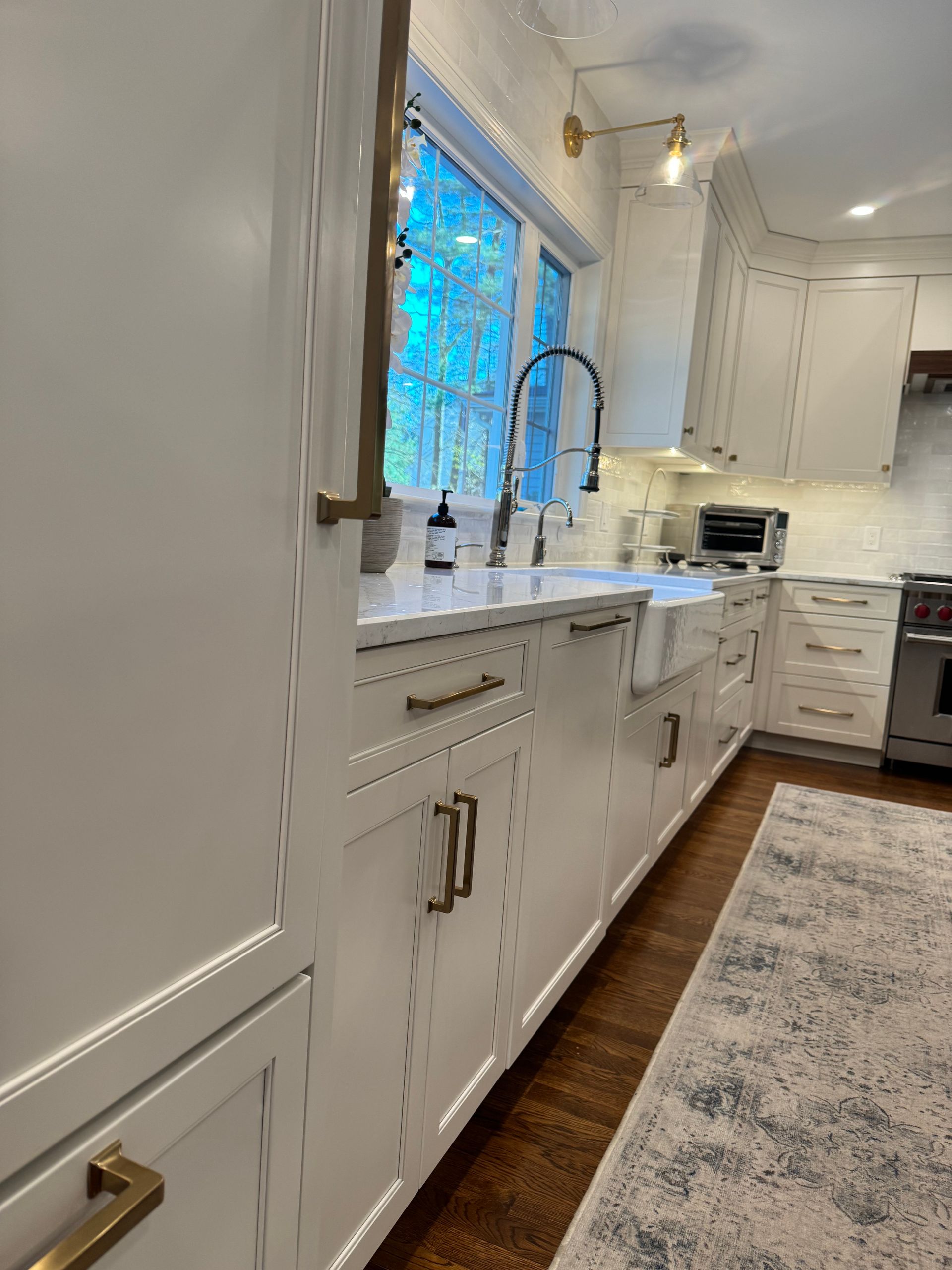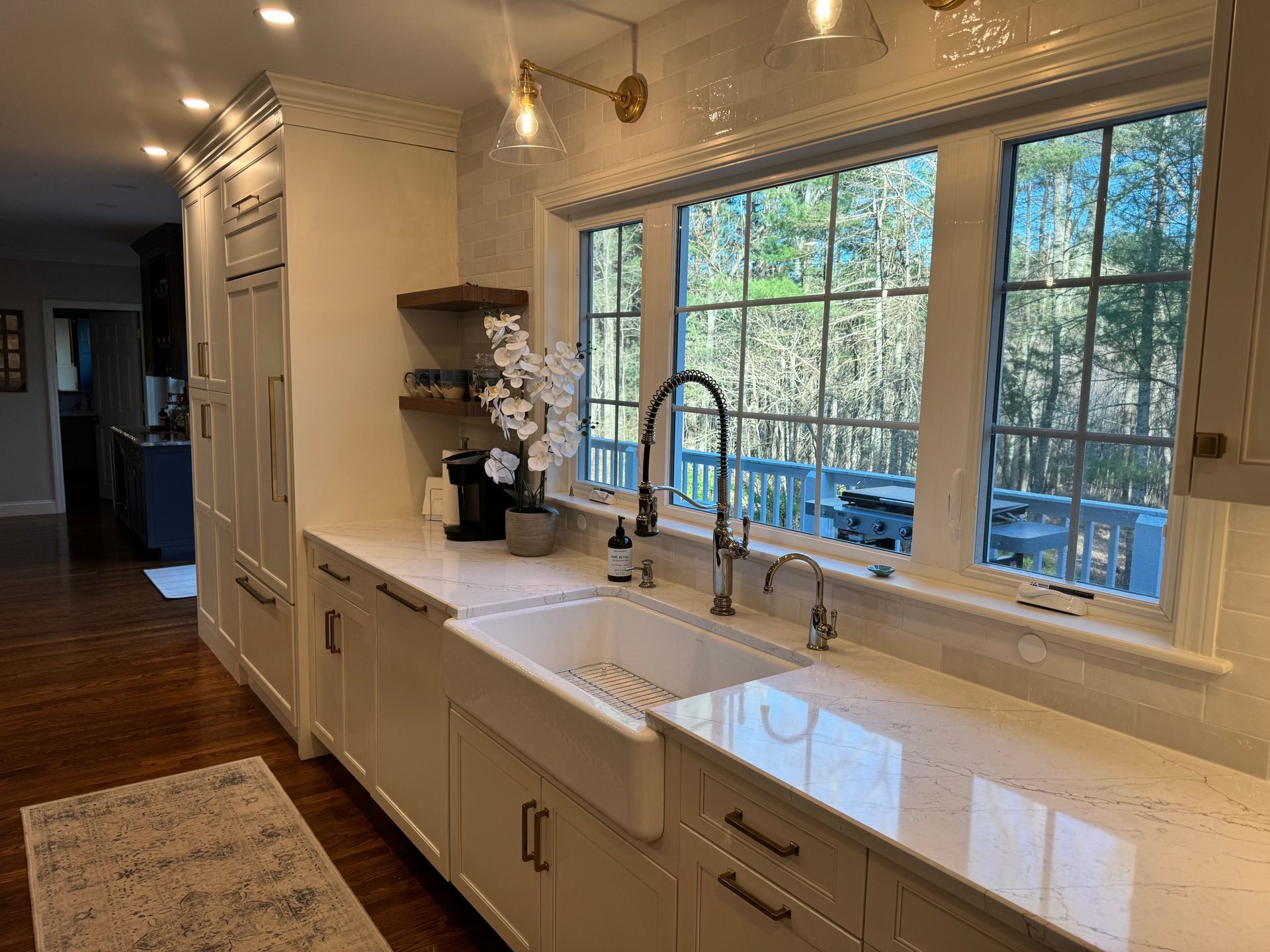 Tedd Wood Luxury Line Custom Monticello Door Style with Alasbaster White paint Finish on perimeter of kitchen & Hand selected natural walnut island. Counter top is Q-Quartz Calacatta Veraldi featuring a double thisck island.