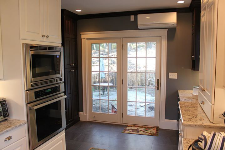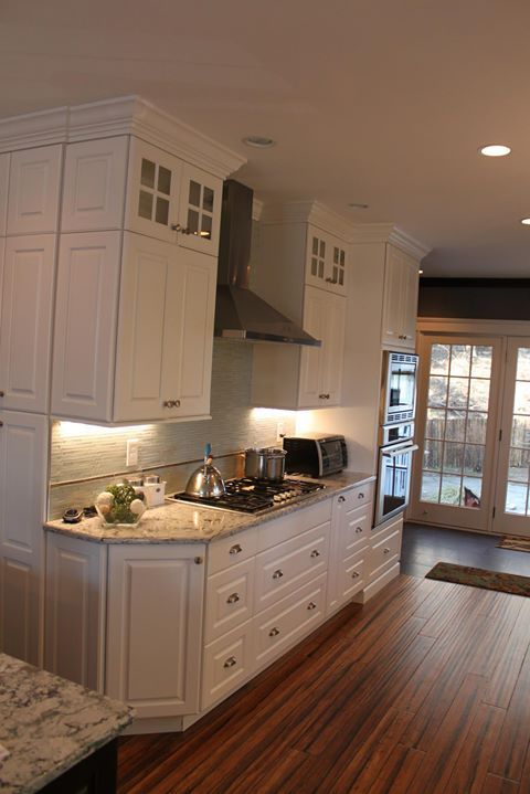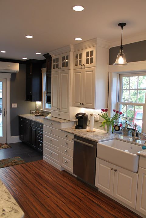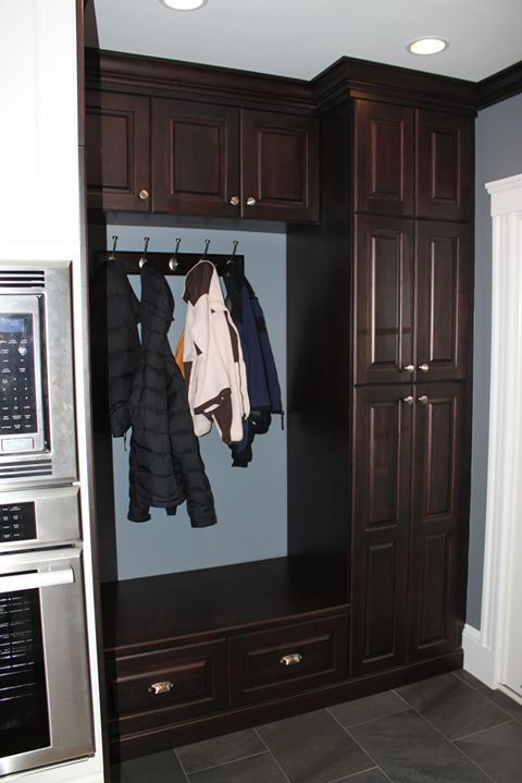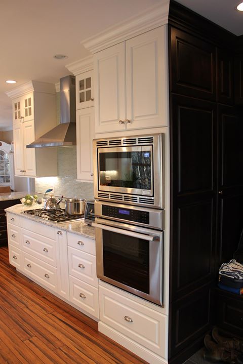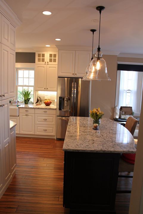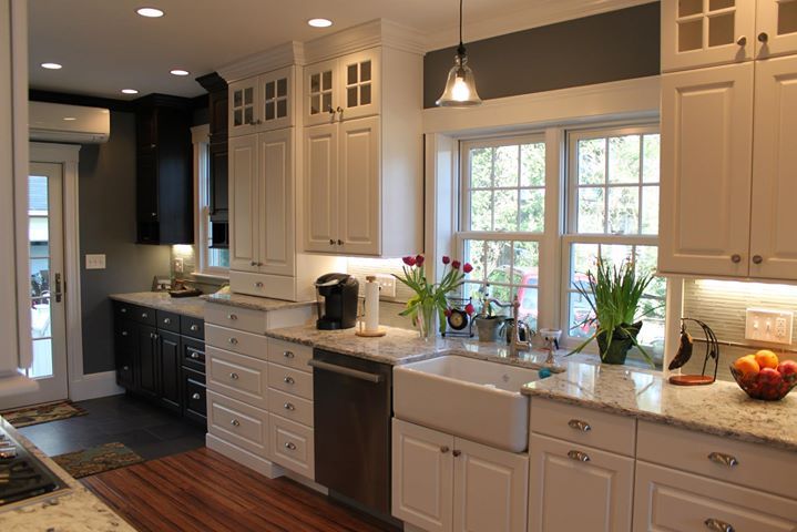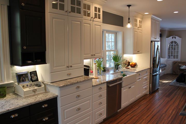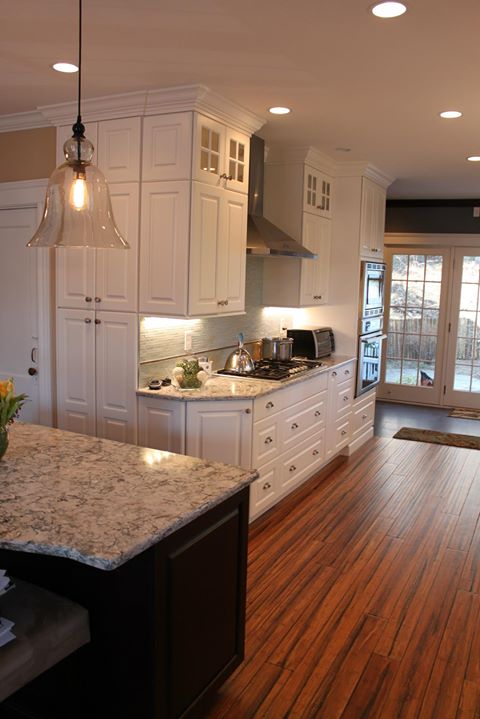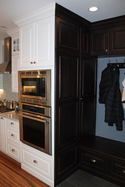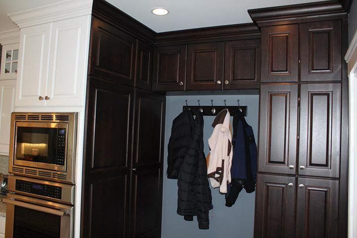 Tedd Wood Luxury Line Custom CRP10 door Style with Frosty White Finish on main part of kitchen & Cherry wood w/Espresso finish on Island and Mudroom. Counter top is Cambria Quartz Praaz Sands . Remodeling courtesy of Sergio Renovations