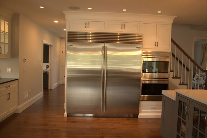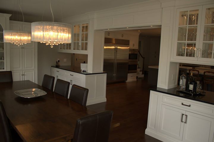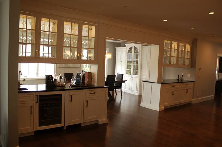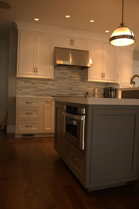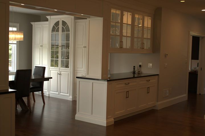 Mouser Custom Cabinetry & Centra Semi-Custom, Inset Plaza door style, Painted white on Perimeter Shale island, Counter tops, Silestone White Zeus (laminated 2-1/2 thick on island), Premium black granite on Hutch/bar are. Designed by Antonio Monteiro. Installation by Eddy Pendleton.