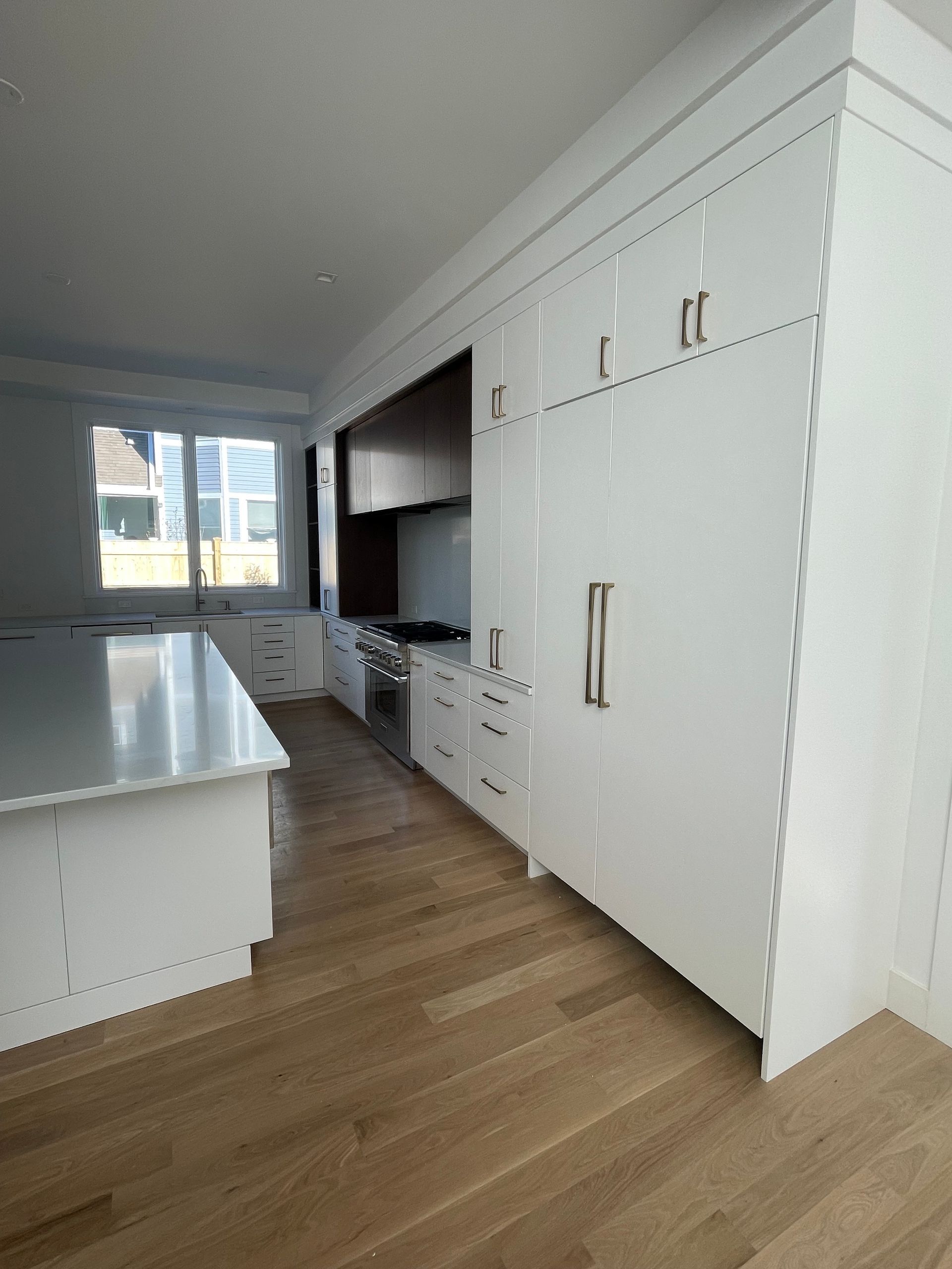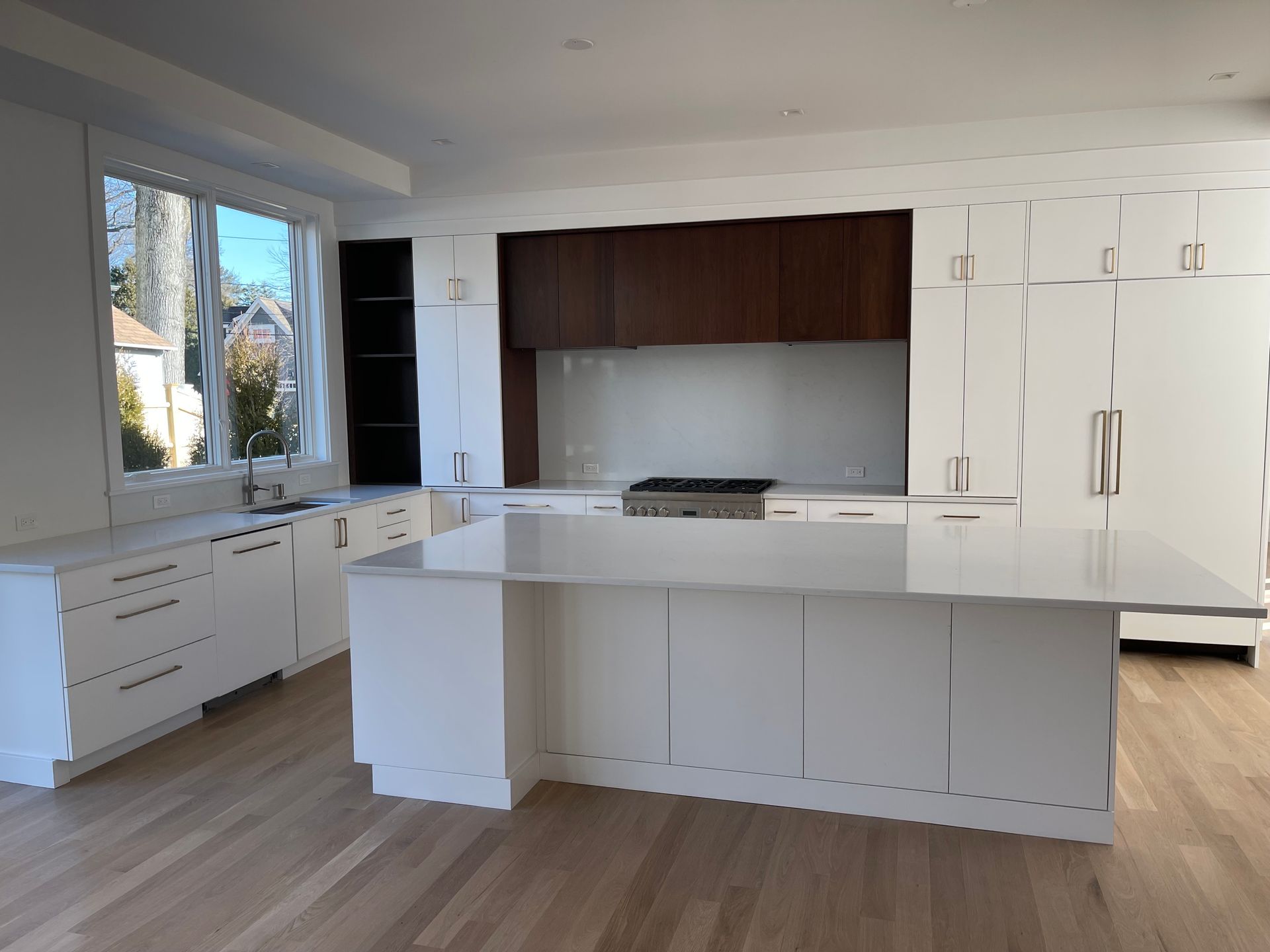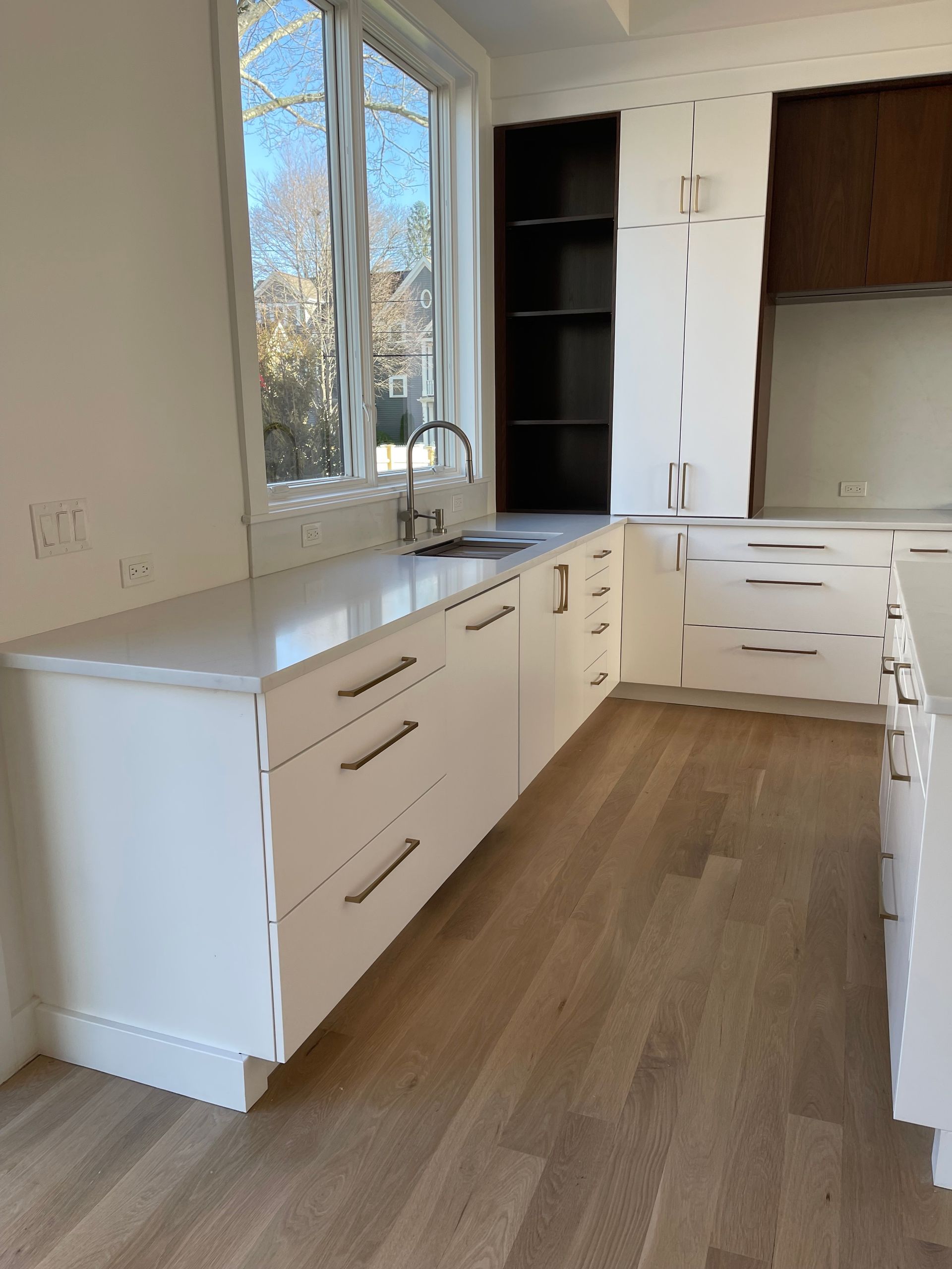 Executive Cabinetry (Twin Kitchens) Sahara Door Style painted White on one and Midnight Gray on the other both with Walnut Cafe accents. White Zen Quartz Countertops