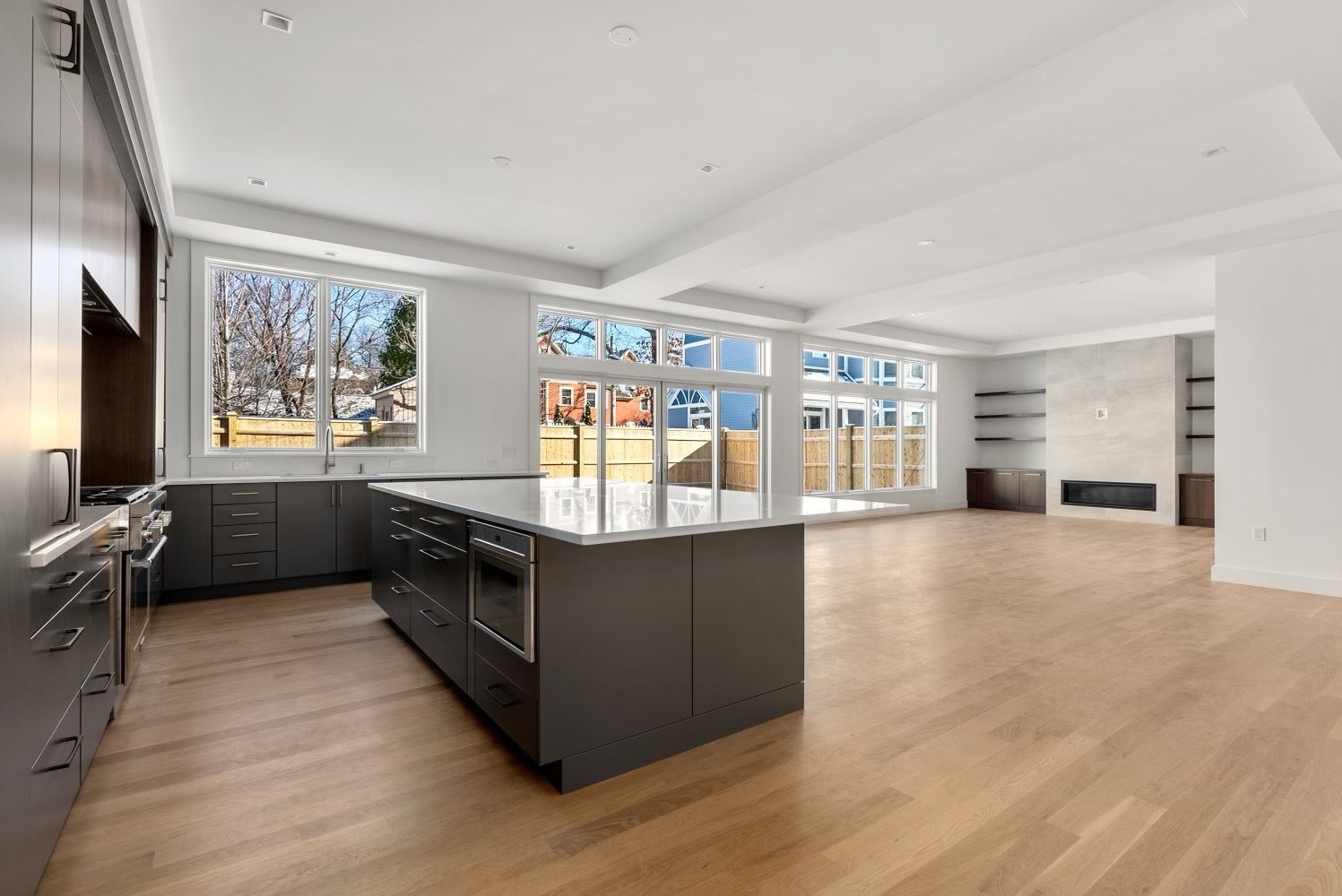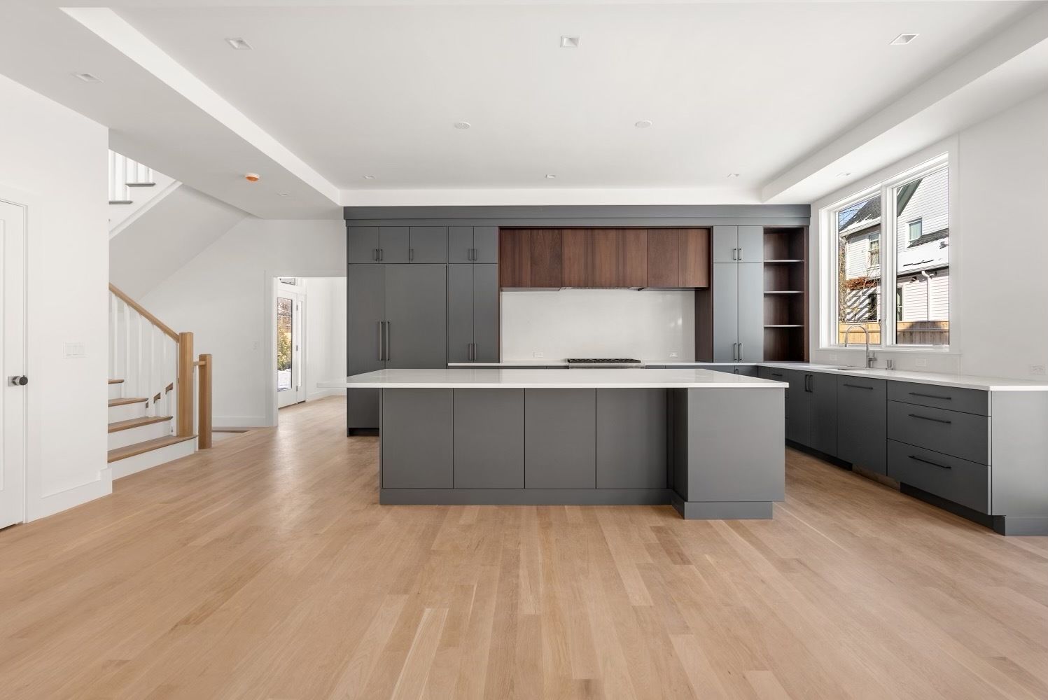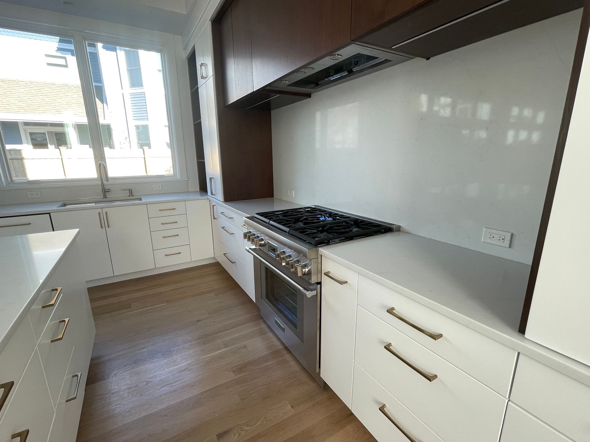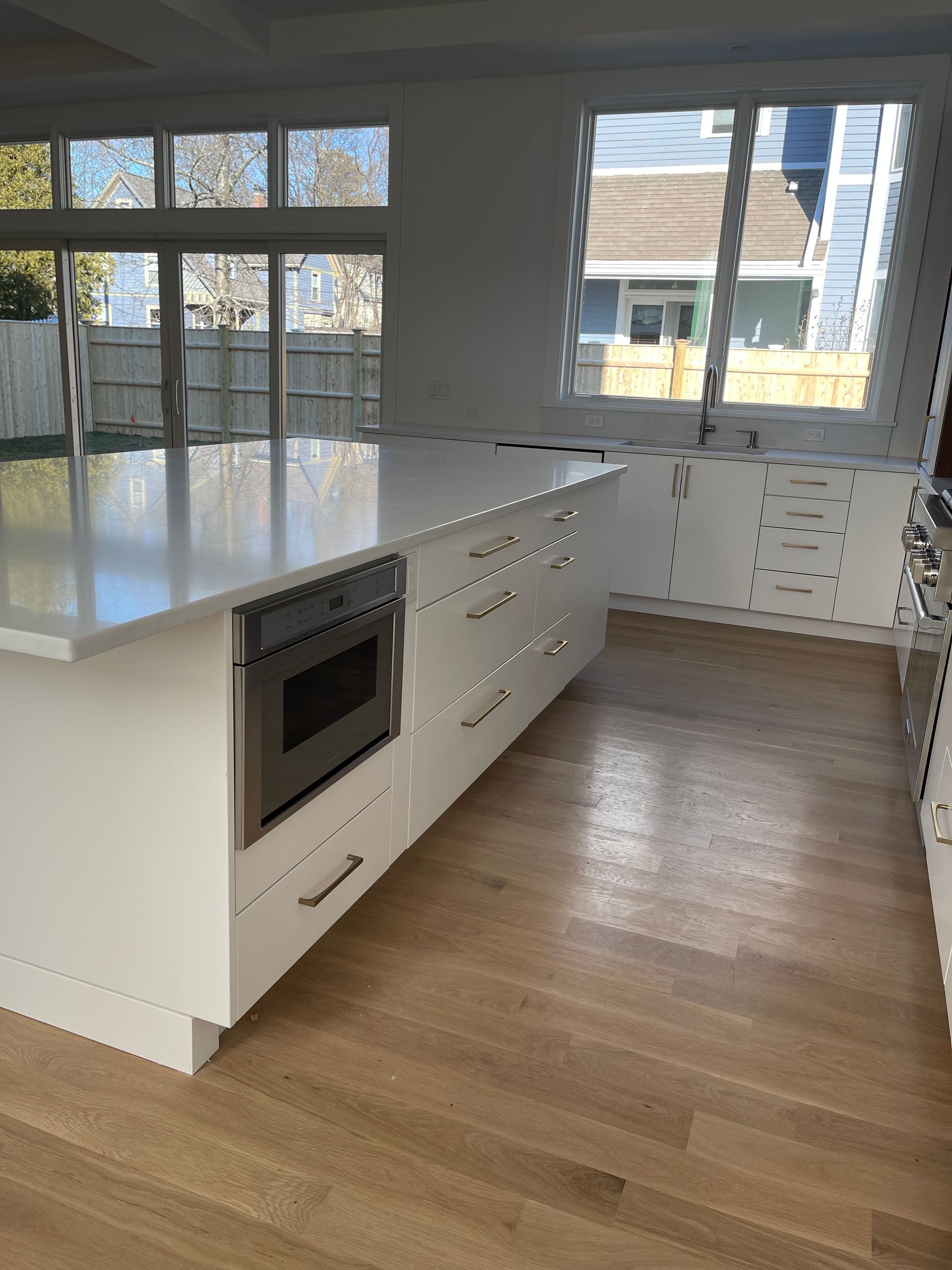 Executive Cabinetry (Twin Kitchens) Sahara Door Style painted White on one and Midnight Gray on the other both with Walnut Cafe accents. White Zen Quartz Countertops
