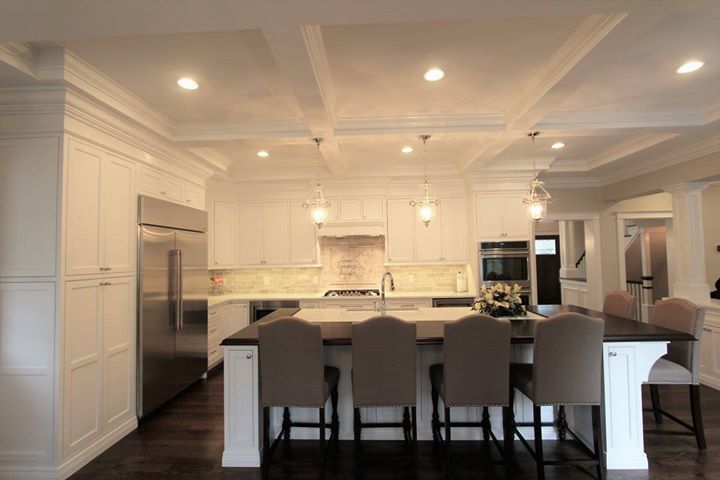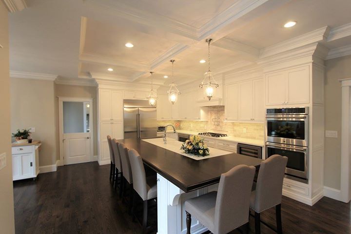 Mouser Custom Cabinetry, Plaza door style painted white. Custom Walnut wood tops with white Quartz.