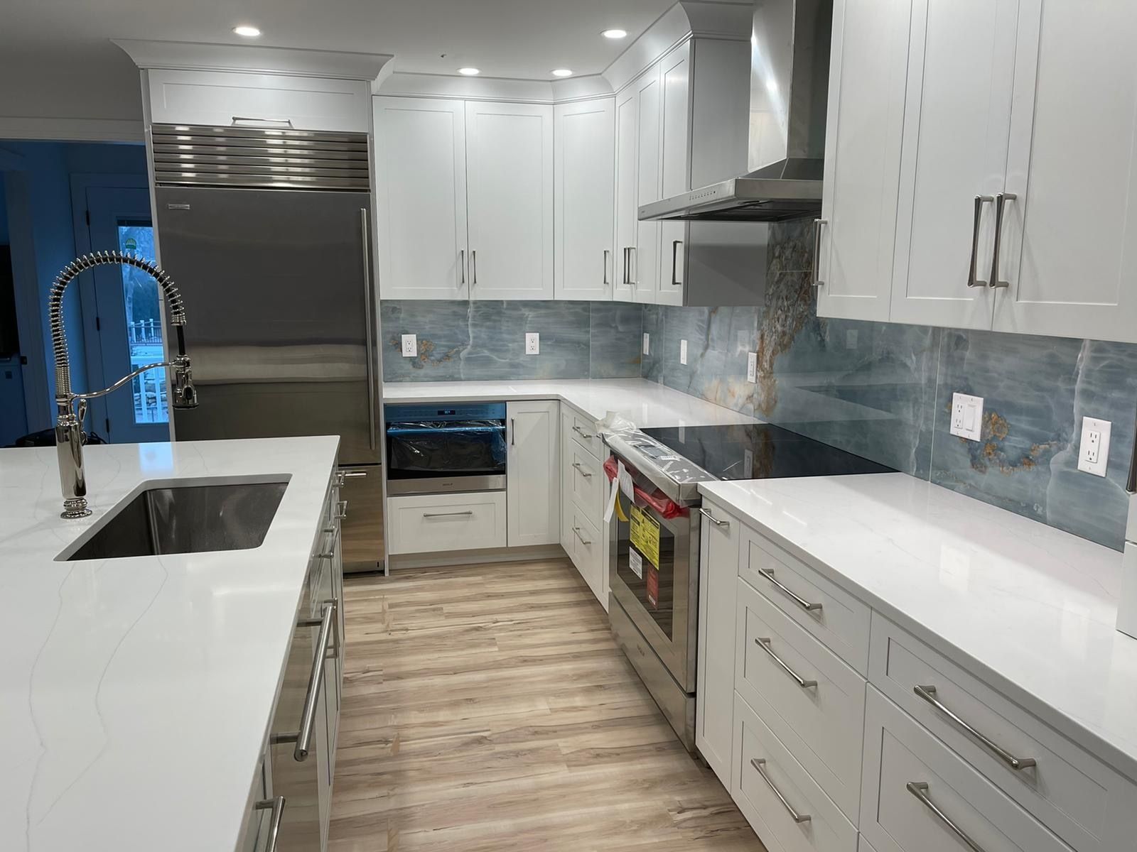 Tedd Wood Luxury Line Custom Gettysburg Door Style with White Finish on main part of kitchen & Custom color on Island. Counter top is Q-Quartz Callacata Clara. Bathroom is Tedd Custom Cabinetry Burlington Door, Rift cut White oak with Dovetone finish.